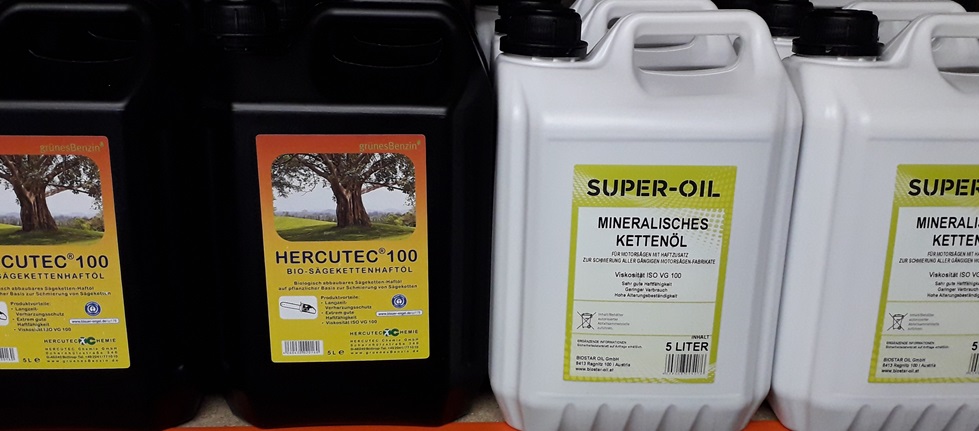 Bei uns erhalten Sie zu Ihrer Sonderkraftstoffbestellung auch mineralisches und biologisches Kettenöl. Beides VG 100.